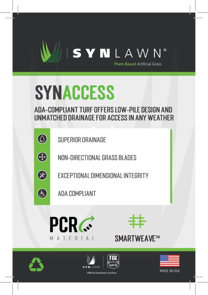Designed to meet ADA, DOJ, and Access Board standards, SYNAccess combines low-pile, nondirectional fibers with SmartWeave™ Technology for superior accessibility and usability. Its advanced backing ensures unrivaled drainage, keeping surfaces safe and functional, even after heavy rain.