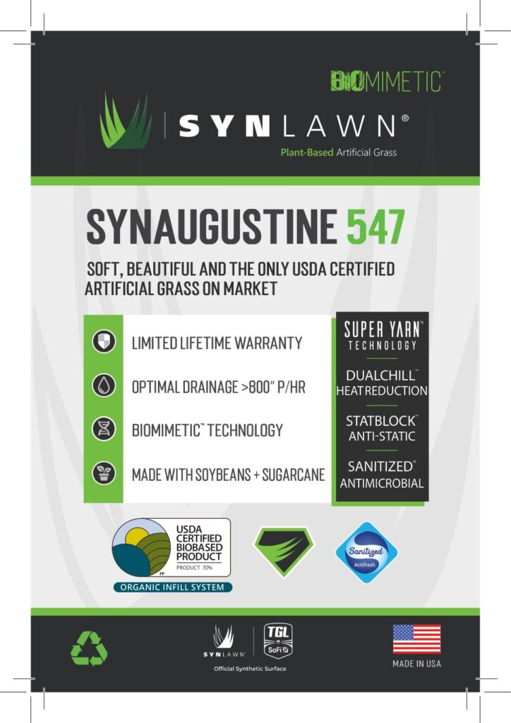 SYNAugustine 547, a USDA Certified Bio-Based turf, combines Super Yarn™ Technology with renewable sugarcane for durability and eco-friendliness. With soft, vibrant multi-tone blades, it’s a stunning, sustainable, and cost-effective landscaping solution.